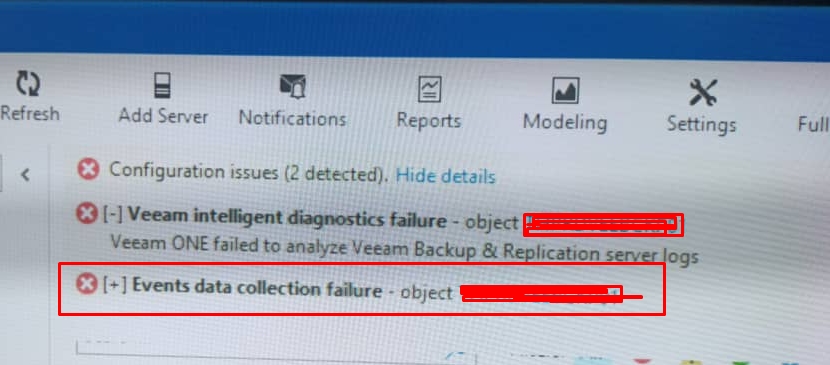 “Events data collection failure – Object bckp01”